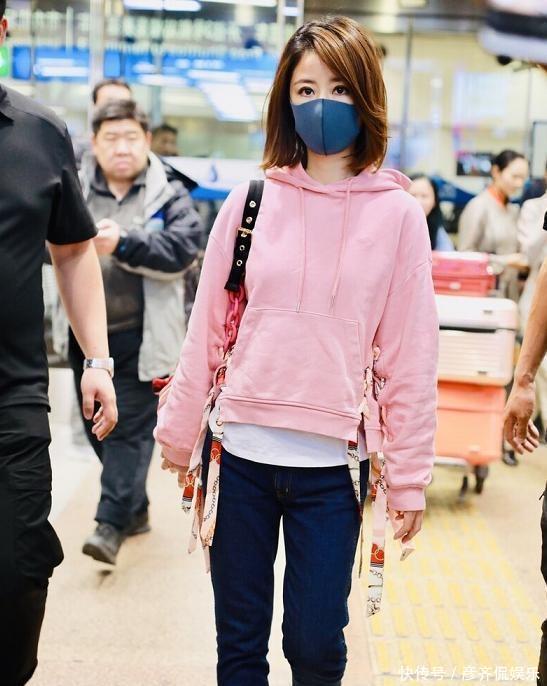 连帽卫衣的帽子一般都有个抽绳,这样在需要的时候可以调调松紧。这件卫衣的袖子除了宽松,还特意做了落肩设计,肉眼可见。这样一来,既能遮住手臂上那些不太好看的拜拜肉,也能遮掩掉肩膀比较溜的问题,真是个好选择。粉色卫衣的长度刚好在屁股上面,我们还能看到里面有白色的布料,敢大胆推测,林心如的上半身是叠穿的。